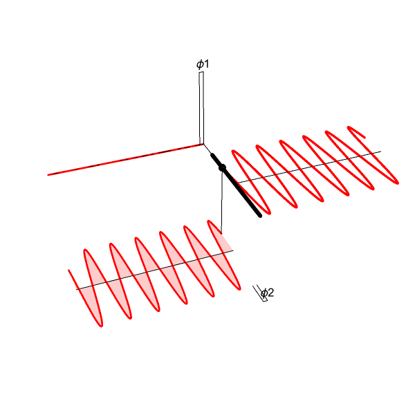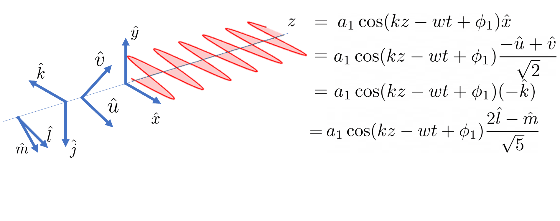 This is just two perpendicular cosine waves added together! Both cosines travel together with the same speed and frequency (described by k, w, z, and t) * . We can change each cosine's individual size/"amplitude" a1 and a2, and its offset/"phase", ϕ1 and ϕ2.