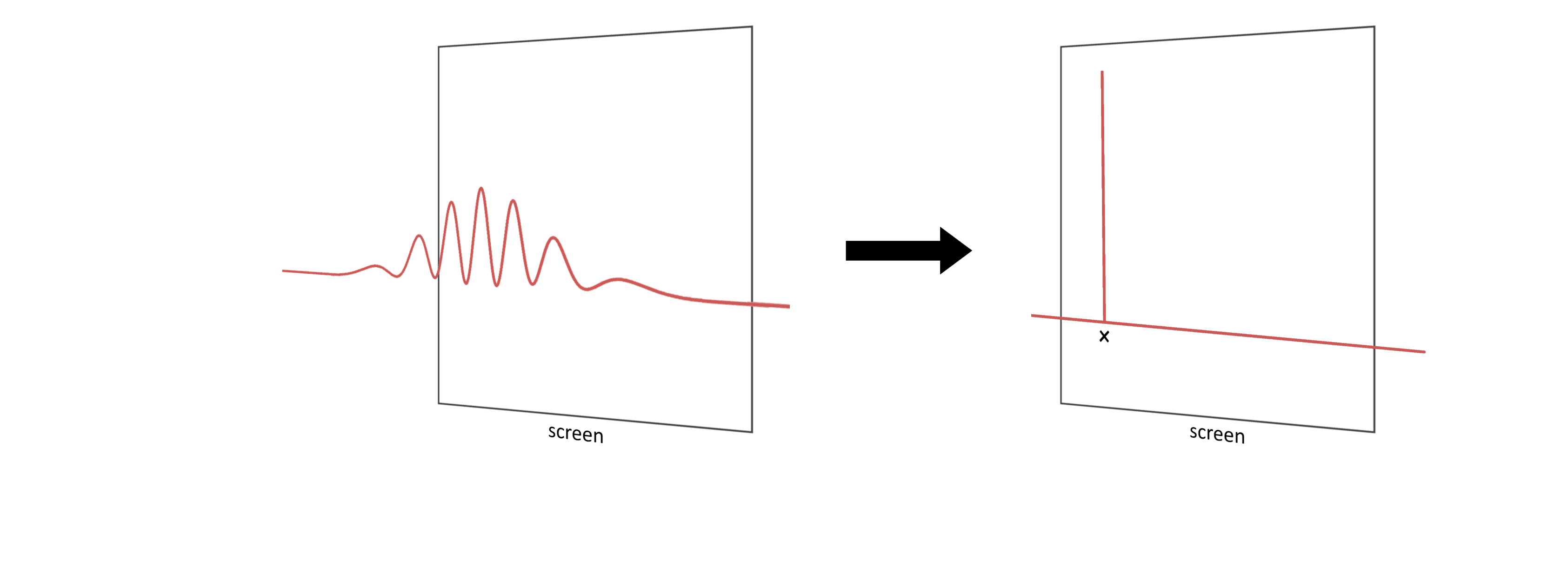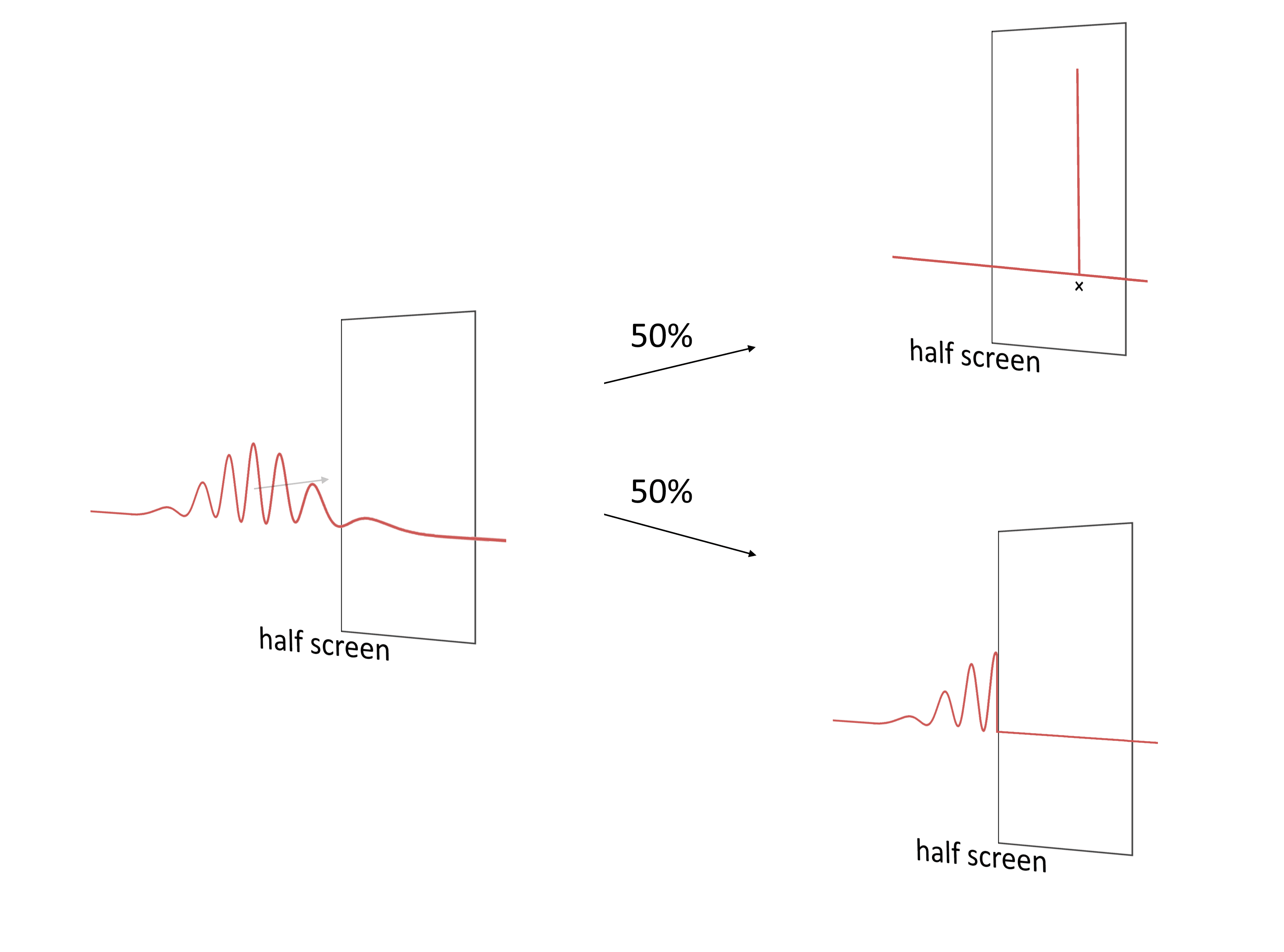 What happens when the wave hits the screen? Well, obviously, the universe needs to decide whether the electron hit the screen or not! We can use similar reasoning as above * to determine what happens: